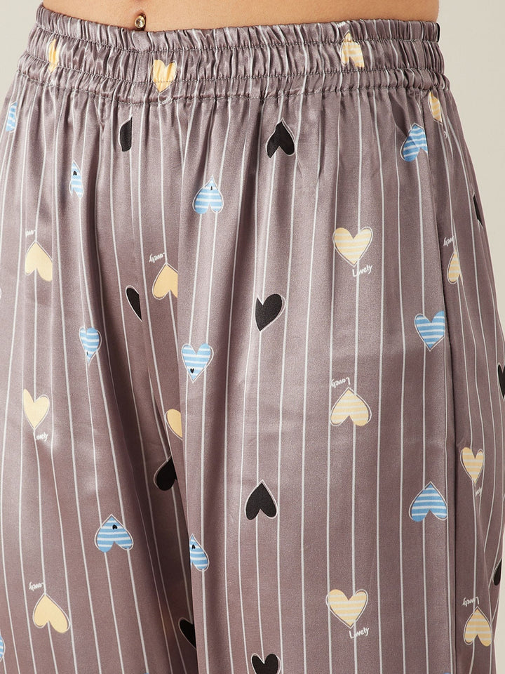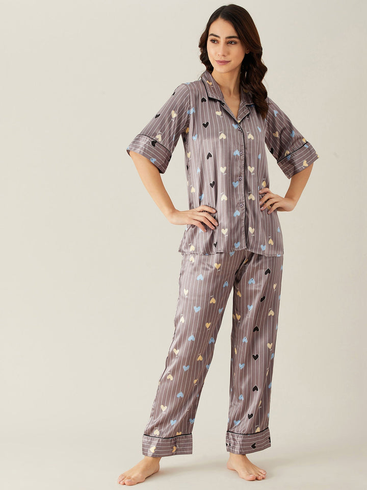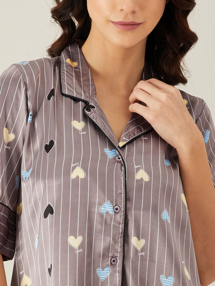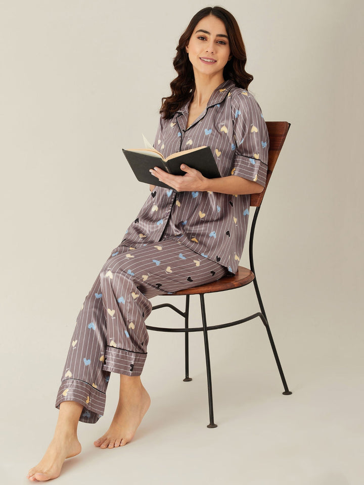 Brown Stripes Hearts Up Satin Pyjama Loungewear