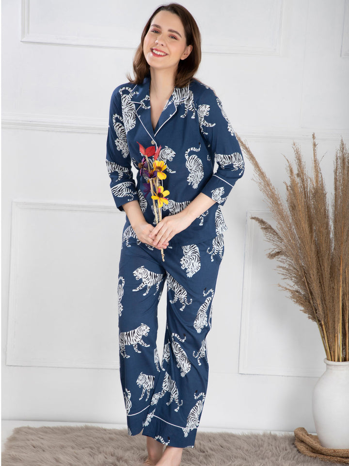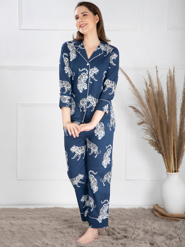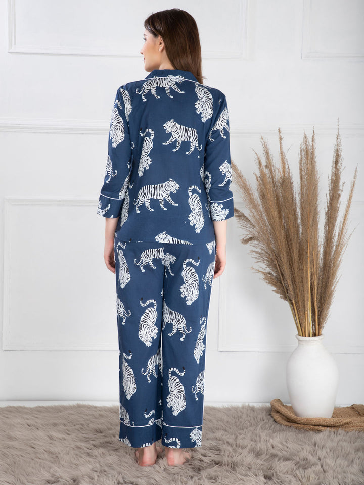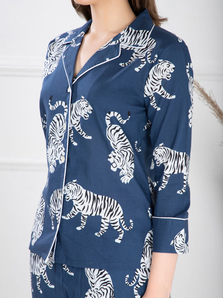 Cotton Sierra Navy Blue Tiger Print Shirt and Pyjama (Set of 2)