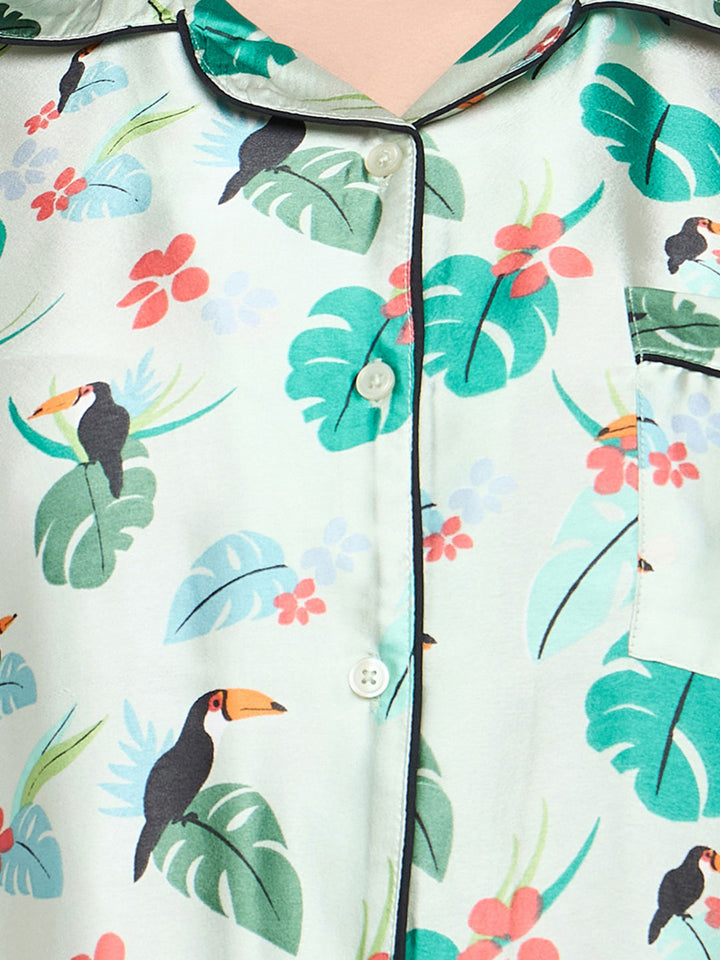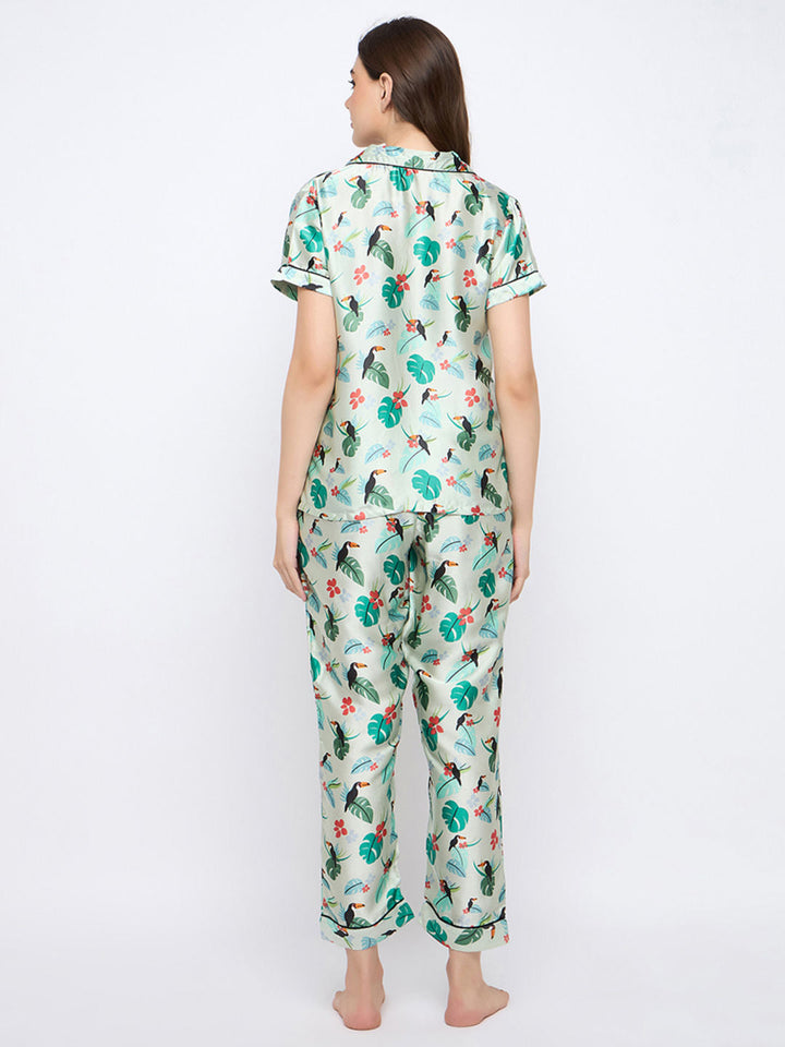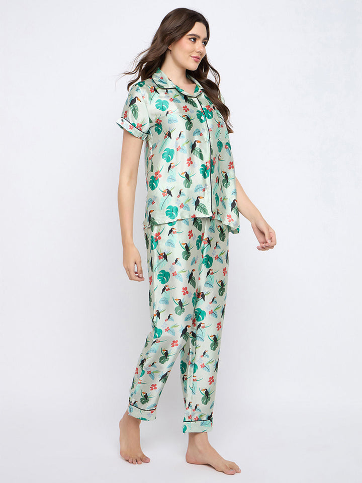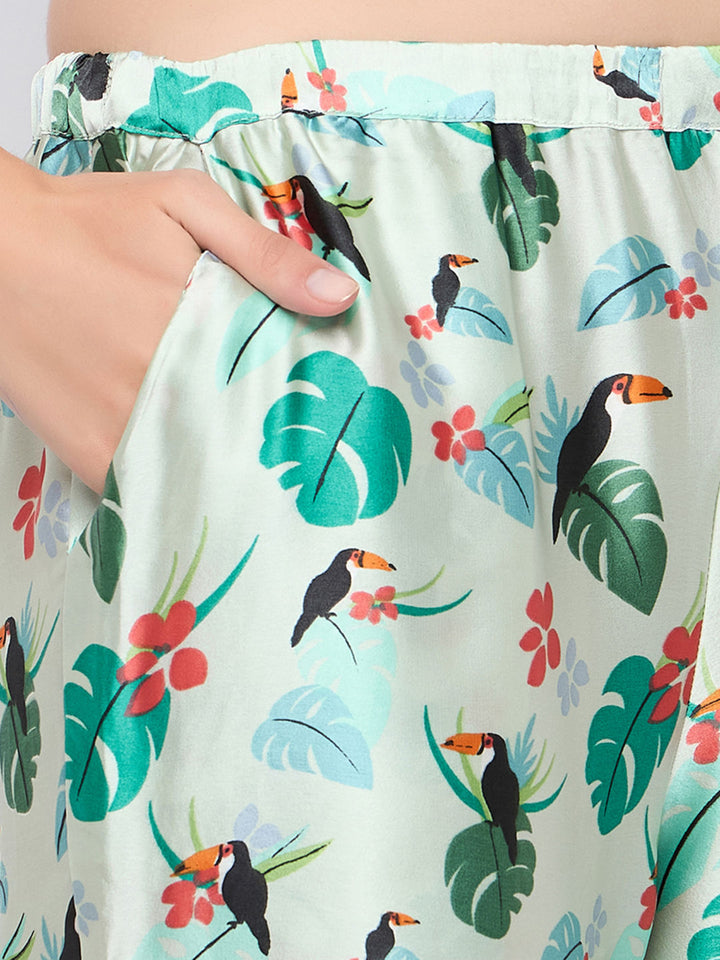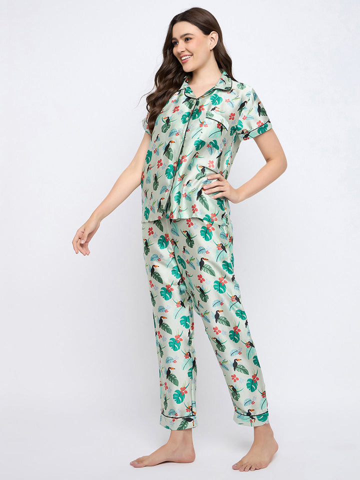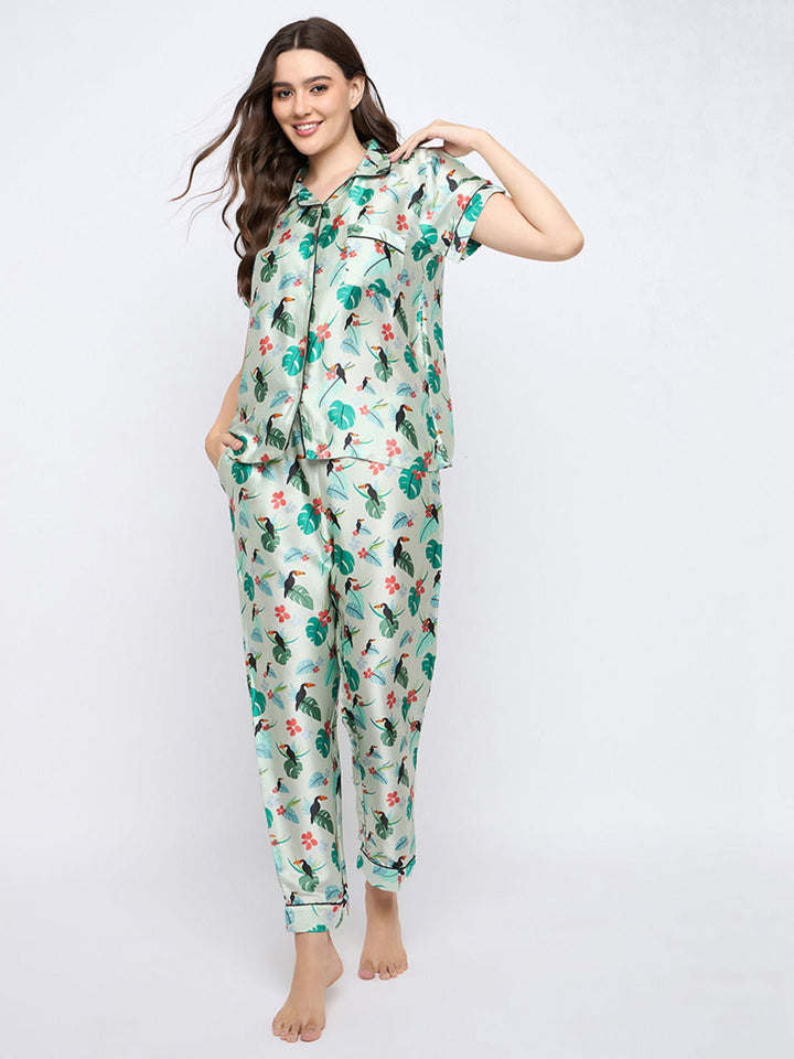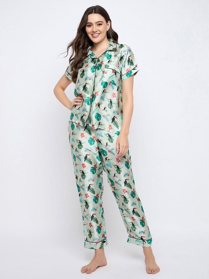 Green Satin Floral Printed Shirt with Pyjama (Set of 2)