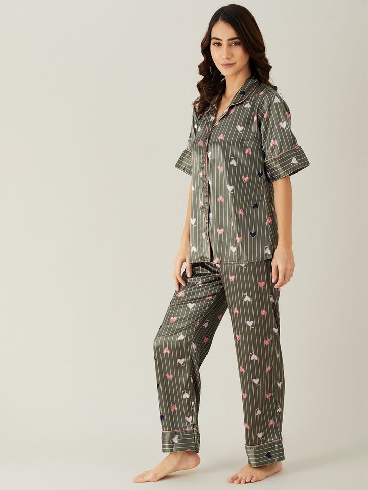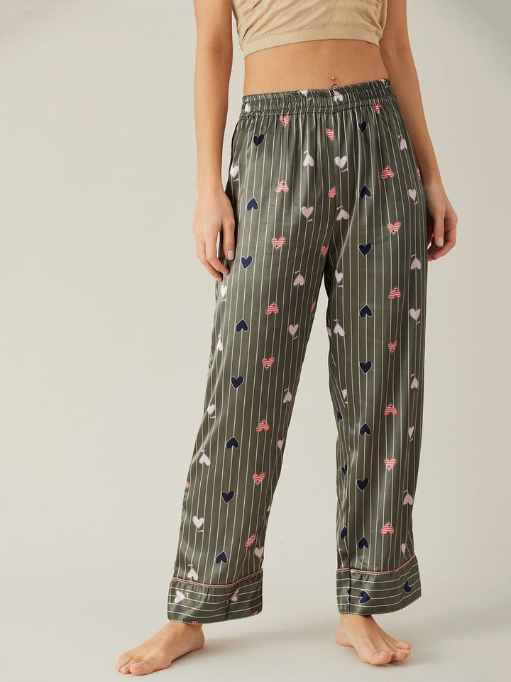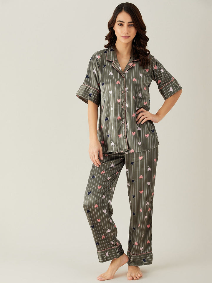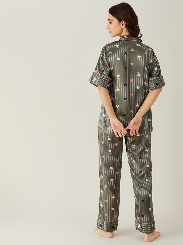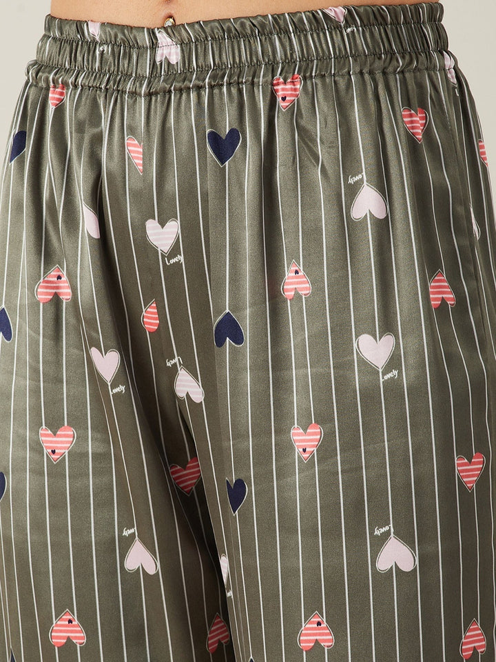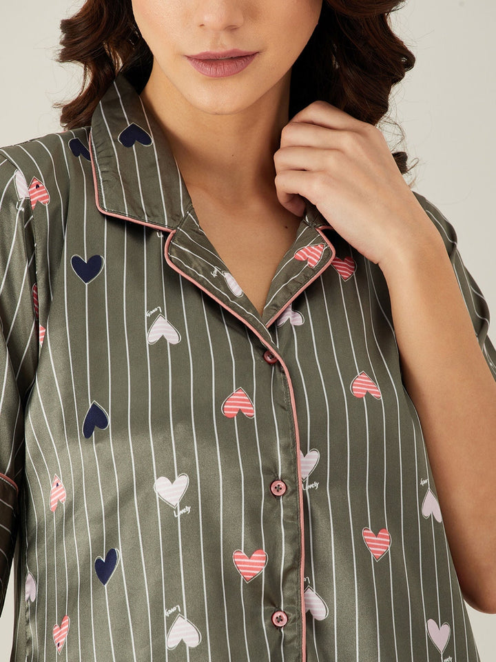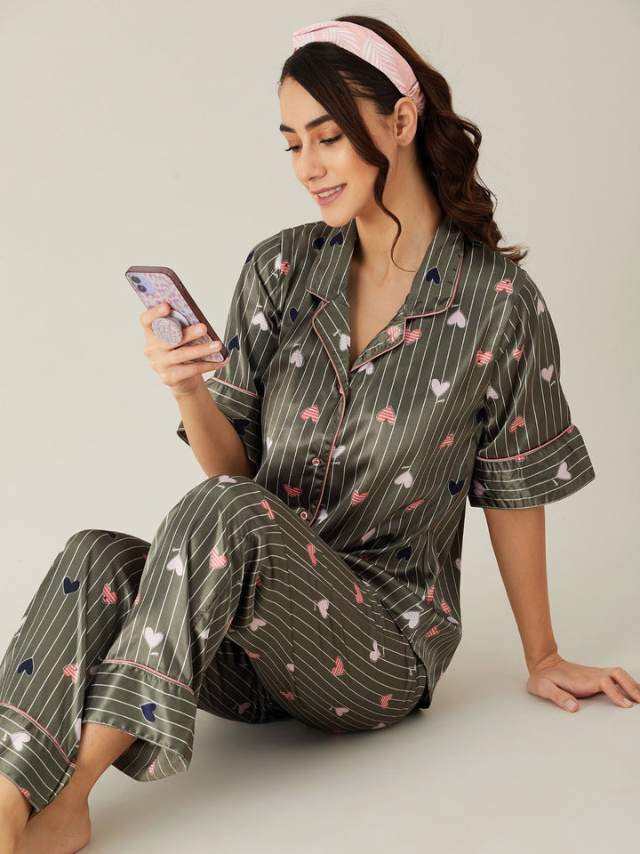 Green Stripes Hearts Up Satin Pyjama Loungewear