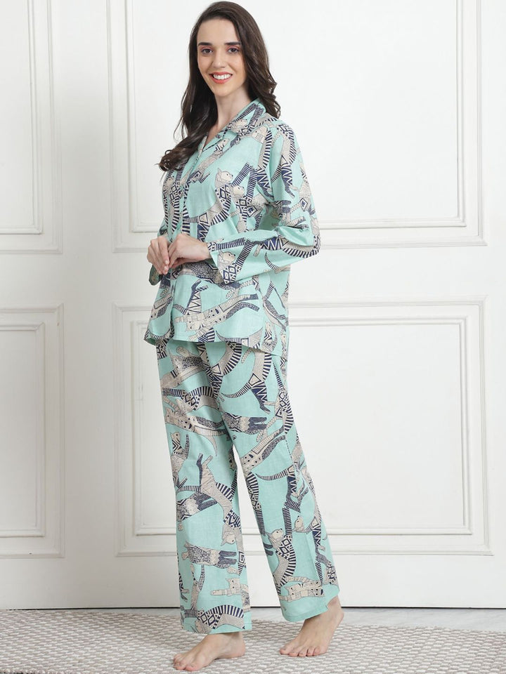 Printed Sea Green Cotton Night Suit (Set of 2)