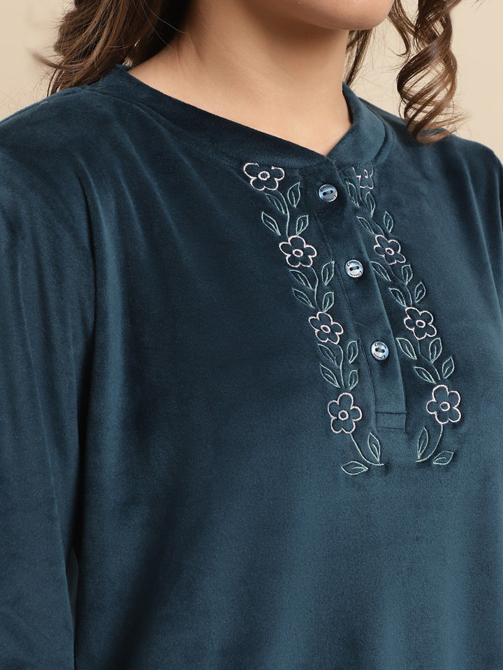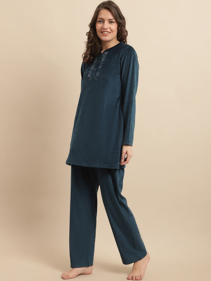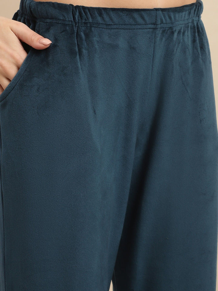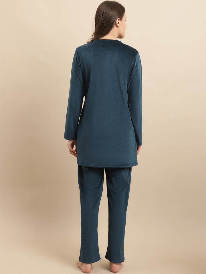Velour Winter Wear Night Suits-Teal (Set of 2)