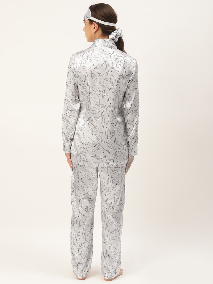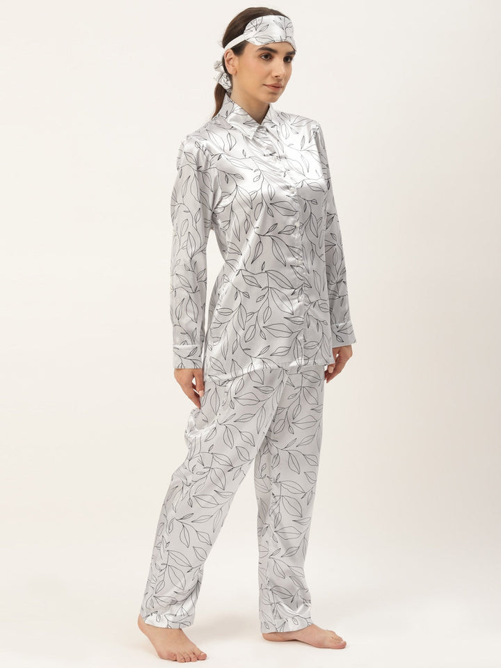 Women 6 Pcs White & Black Tropical Print Satin Pyjama Set