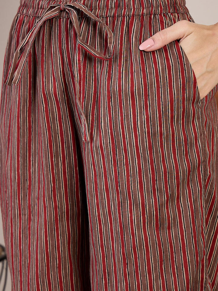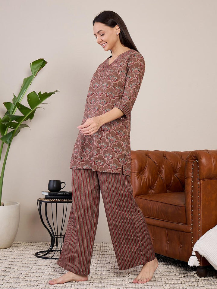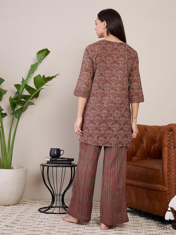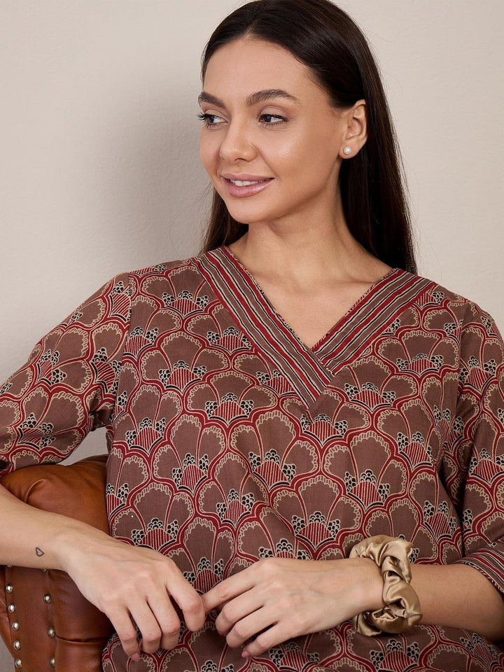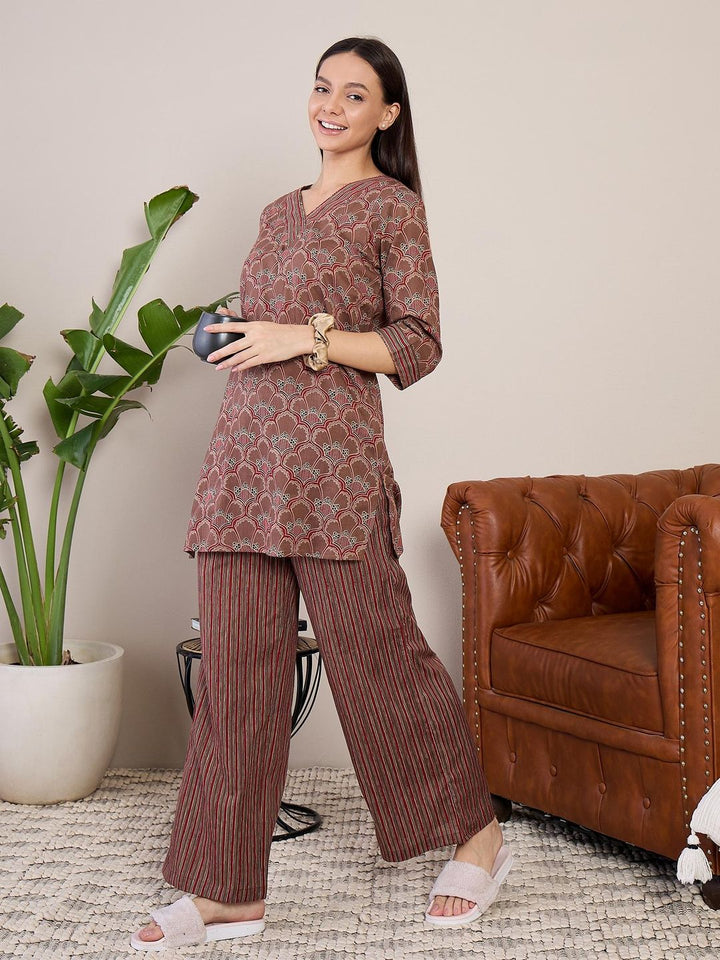 Women Brown Cotton Long Kurti with Pant - (Set of 2)