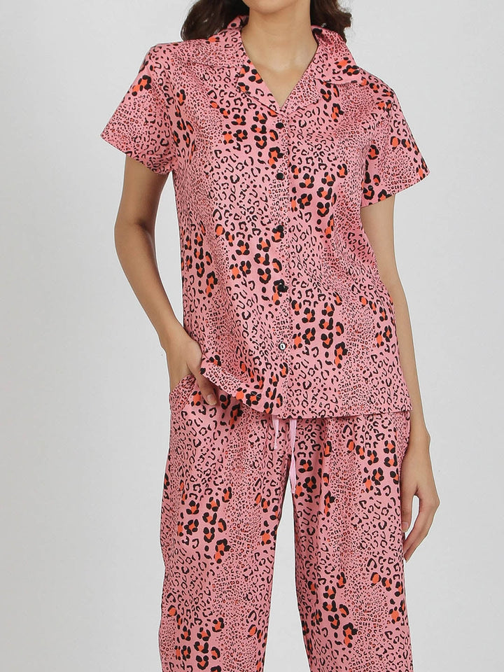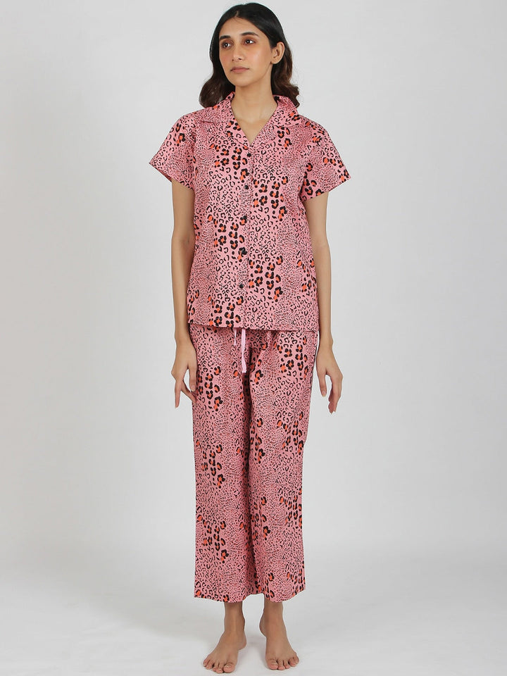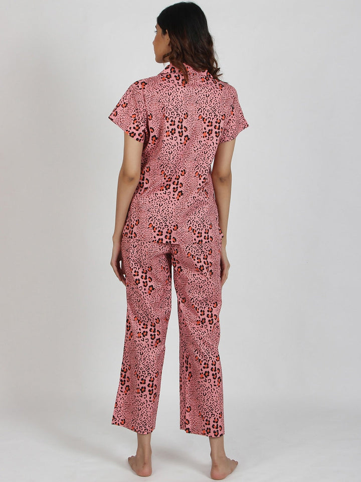 Women Pink & Orange Printed Cotton Leopard Night suit