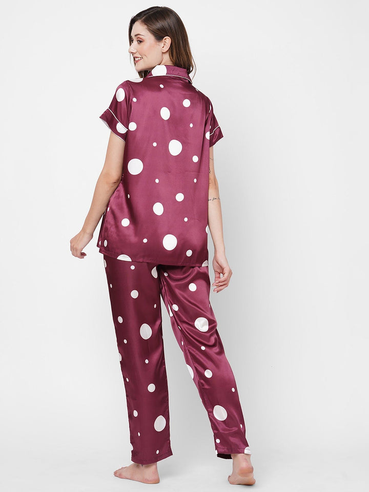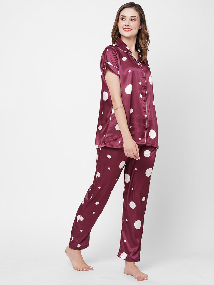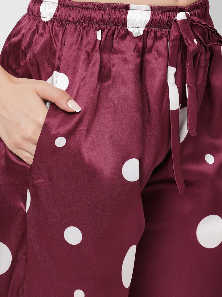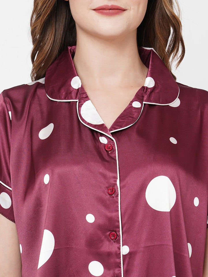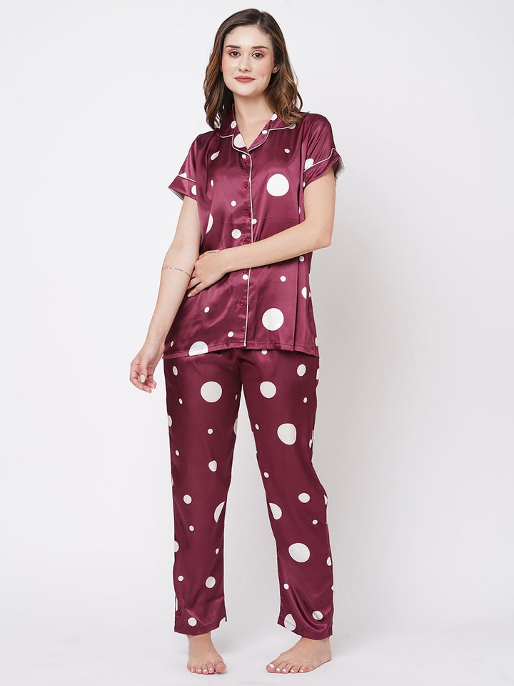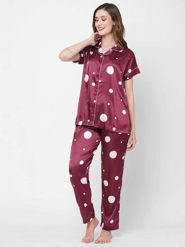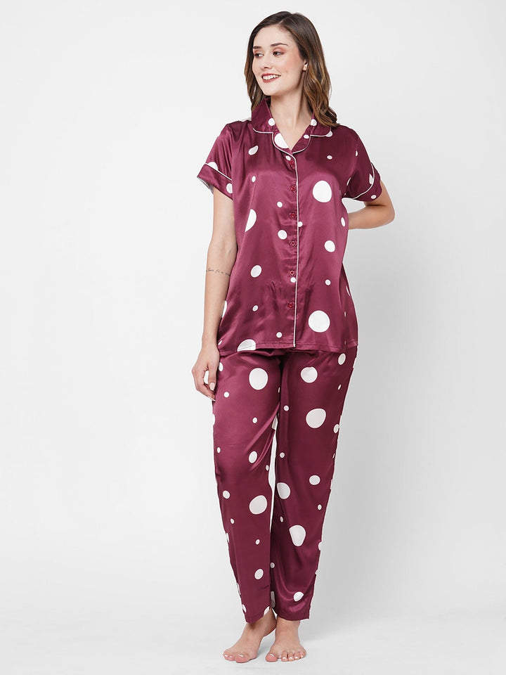 Women Printed Satin Maroon Night Suit (Set of 2)